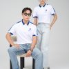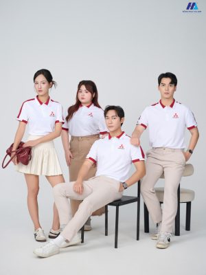 Về màu sắc, áo đồng phục polo lựa chọn tone màu trắng thanh lịch và tinh khôi làm màu sắc chủ đạo. Gam màu bích được thêm vào các chi tiết cổ, vai và bo viền tay áo, tạo nên một điểm nhấn độc đáo, nổi bật.